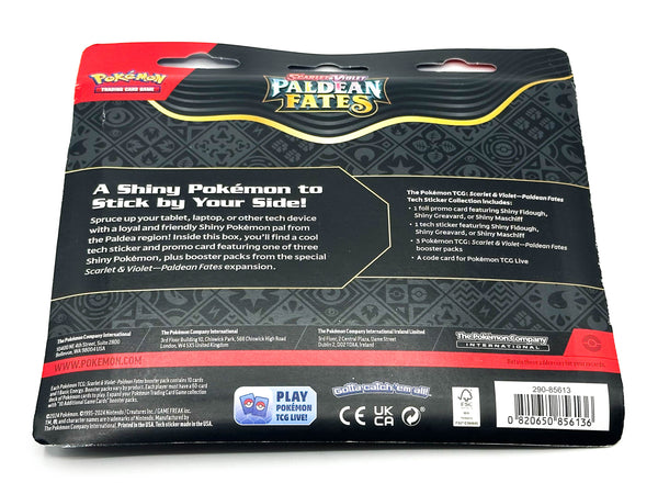 Treat yourself—and your tablet, laptop, or other device—to a loyal and friendly Shiny Pokémon pal from the Paldea region! Inside this box, you’ll find a paws-itively adorable tech sticker and promo card featuring one of three Shiny Pokémon, plus booster packs from the special Scarlet & Violet—Paldean Fatesexpansion.